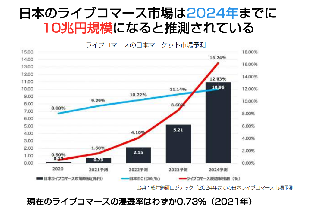 2022年現在、ライブコマースの国内浸透率は0.73%と非常に低い水準ではありますが、今後2年間で2024年には10兆円規模の市場になることが予測されています。まさに、2022年はライブコマース元年といえます。